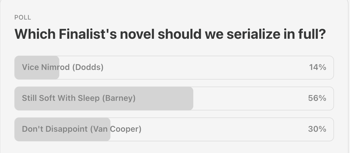 We’re excited to announce the winner of our second quarterly Serial Novel Contest: Vincenzo Barney’s Still Soft With Sleep. It’s going to be quite a ride. We were also deeply impressed by the quality of our finalists this quarter: from Martin Van Cooper’s ironic, Franzenesque social scope in Don't Disappoint, to Colin Dodds’ bracing Biblical satire in Vice Nimrod. Alas, even at the Athenian Dionysia, sometimes you had to choose between Euripides and Sophocles. We strongly encourage you to follow our finalists’ future efforts on Substack at Don't Read the Dust Jacket and No Homework.